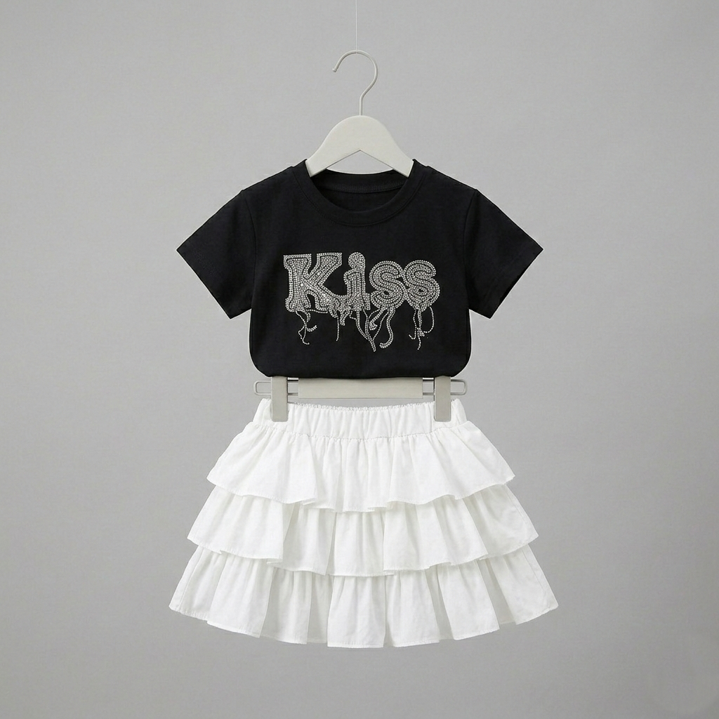 Design: A stylish two-piece set featuring a black short-sleeved t-shirt paired with a white tiered skirt.